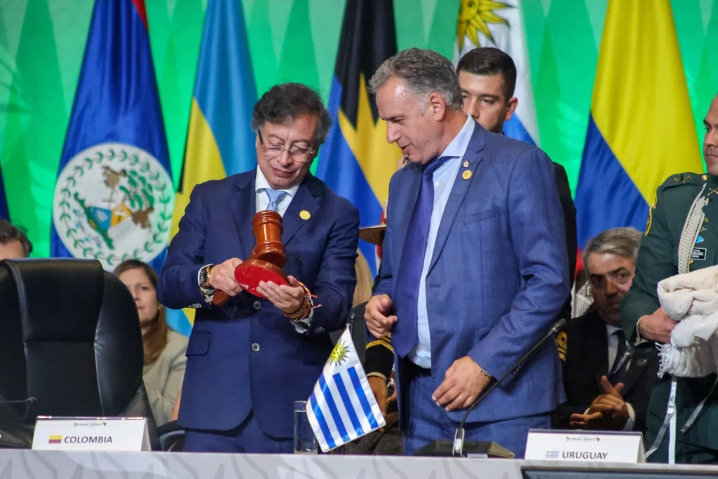El traspaso fue encabezado por el presidente de Colombia, Gustavo Petro, quien entregó la Presidencia Pro Témpore al presidente de Uruguay, Yamandú Orsi, en el encuentro que contó con la participación de mandatarios y autoridades de la región. Como parte del acto protocolar, se hizo entrega del mazo que simboliza la autoridad del organismo regional y de la bandera de la CELAC.