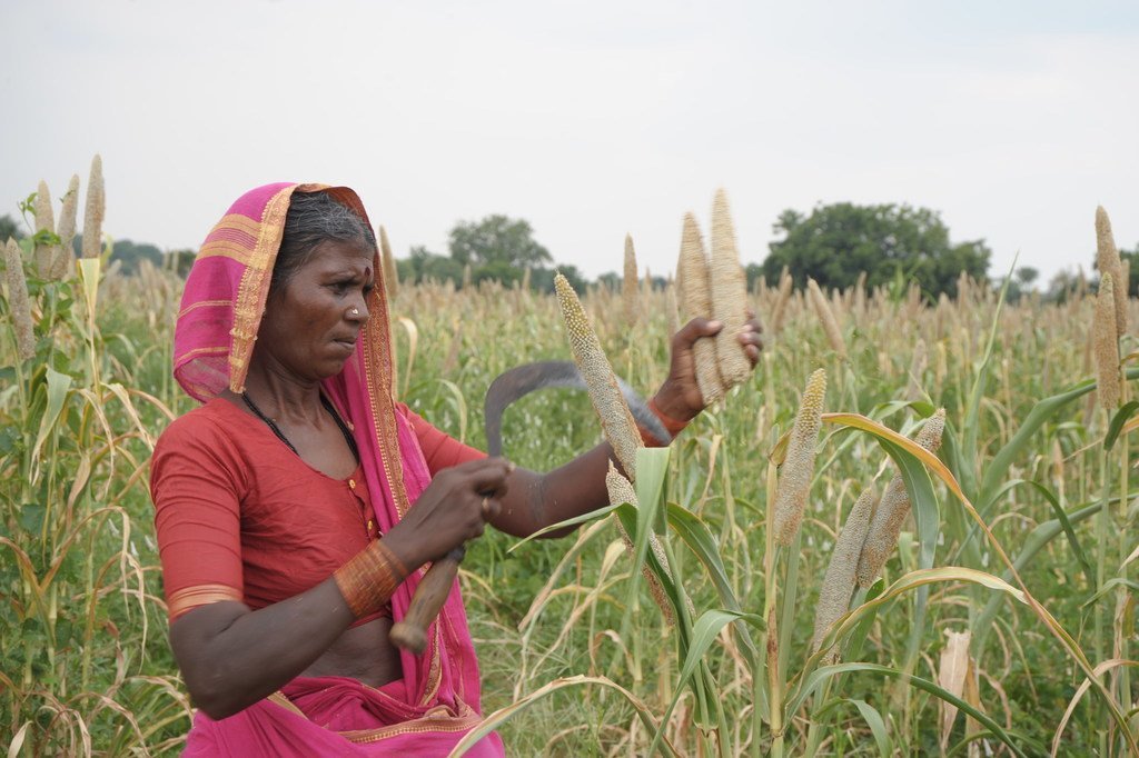 Una campesina cosecha mijo en la India.