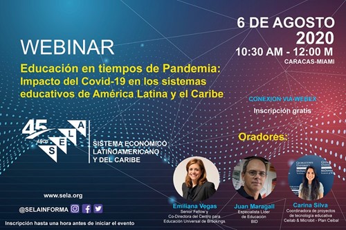 On Thursday 6 August at 10:30 am in Caracas and 11:30 am in Montevideo, the Latin American and Caribbean Economic System (SELA) will hold a Webinar on “Education in times of pandemic: Impact of COVID-19 on the educational systems of Latin America and the Caribbean”. The event will count on a panel made up of […]