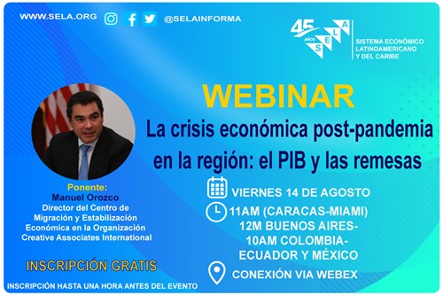 On Friday 14 August at 11:00 am in Caracas, the Latin American and Caribbean Economic System (SELA) will hold a Webinar on “The post-pandemic economic crisis on the continent: GDP and remittances”. The virtual session will be in charge of Manuel Orozco, former Director of the Programme on Migrations, Remittances and Development at the Inter-American […]