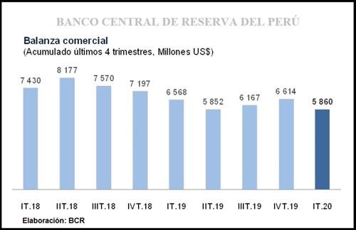 La balanza comercial anualizada alcanzó quince trimestres consecutivos de superávit, acumulando un saldo de 5,860 millones de dólares al primer trimestre de 2020, indicó hoy el Banco Central de Reserva (BCR).
