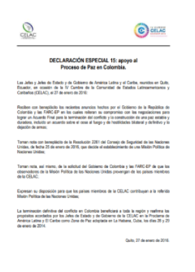 Declaración especial 15: apoyo al Proceso de Paz en Colombia. IV Cumbre CELAC