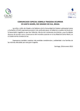 Comunicado especial sobre la tragedia ocurrida en Santa María, Río Grande do Sul, Brasil