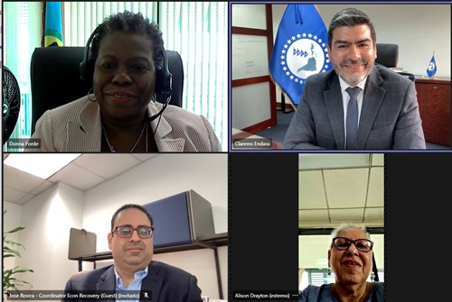 El Secretario Permanente del SELA, Embajador Clarems Endara, sostuvo un encuentro con la Embajadora Donna Forde, Secretaria General Adjunta de Relaciones Exteriores y Comunitarias de Caricom, donde destacaron la importancia de fortalecer la convergencia en temas de especial interés para el Caribe, como la Gestión de Riesgos de Desastres y la Seguridad Alimentaria, para lo cual acordaron reuniones específicas para avanzar en una hoja de ruta al respecto.